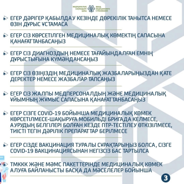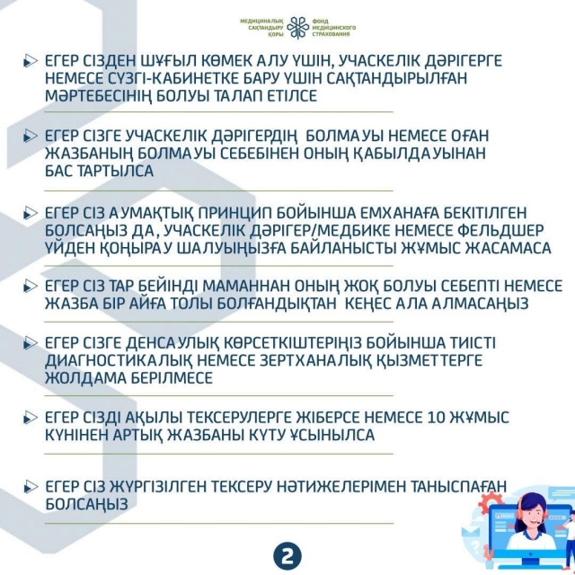 Жарияланған күні: 27-11-2025 Егер сізге медициналық көмек көрсетуден себепсіз бас тартылса немесе медициналық көмек алу кезінде қиындықтар туындаса, сол емханадағы Пациенттерді қолдау және ішкі сараптама қызметіне жүгіну қажет.