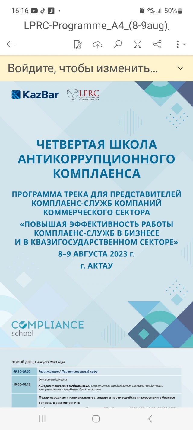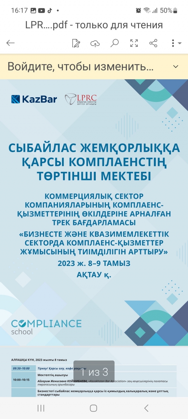 2023 жылғы 8-9 тамыз күндері Ақтау қаласында «Kazakhstan Bar Association» заң кеңесшілері палатасының ұйымдастыруымен, «Құқықтың саясатты реттеу орталығы» қоғамдық қоры сыбайлас жемқорлыққа қарсы комплаенс мектебі шеңберінде, «Бизнесте және квазимемлекеттік секторда комплаенс-қызметтер жұмысының тиімділігін арттыру» тақырыбында тренингөтті. Дәріске бизнес [...]