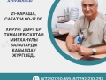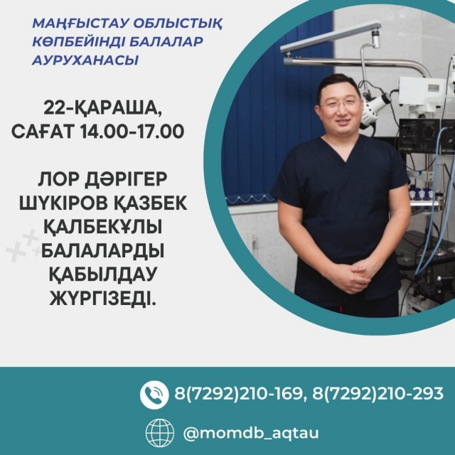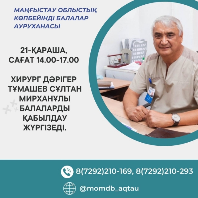 - 21-қараша, сағат 14.00-17.00 аралығында хирург дәрігер - Тұмашев Сұлтан Мирханұлы балаларды қабылдау жүргізеді.