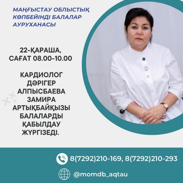 - 22-қараша, сағат 08.00-10.00 аралығында кардиолог дәрігер - Алпысбаева Замира Артықбайқызы балаларды қабылдау жүргізеді.