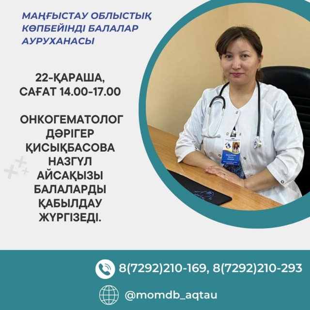 - 22-қараша, сағат 14.00-17.0 аралығында онкогематолог дәрігер - Қисықбасова Назгүл Айсақызы балаларды қабылдау жүргізеді.