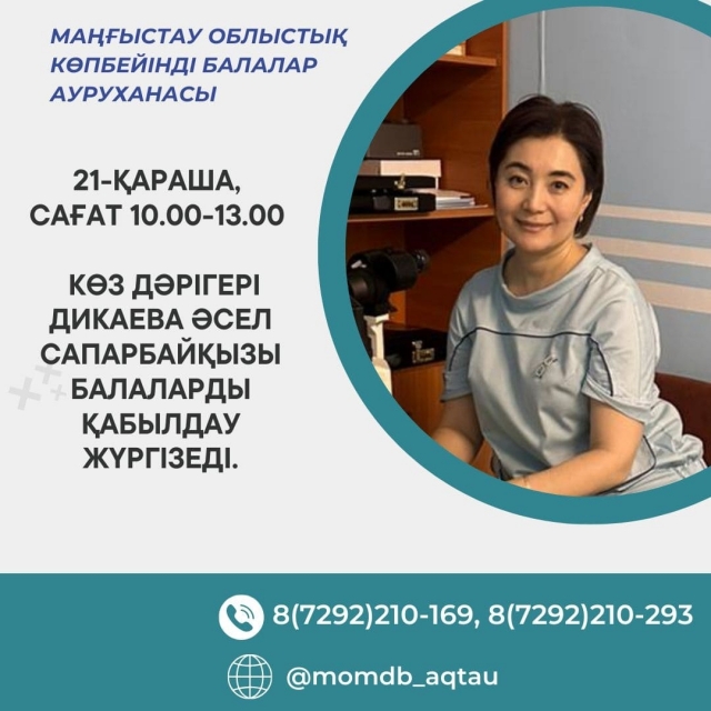 - 21-қараша, сағат 10.00-13.00 аралығында окулист дәрігер - Дикаева Әсел Сапарбайқызы балаларды қабылдау жүргізеді.