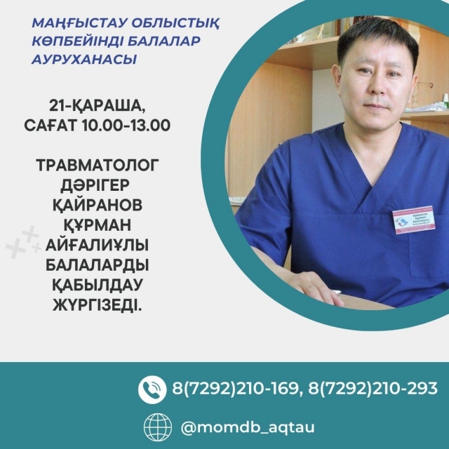 - 21-қараша, сағат 10.00-13.00 аралығында травматолог дәрігер - Қайранов Құрман Айғалиұлы балаларды қабылдау жүргізеді.