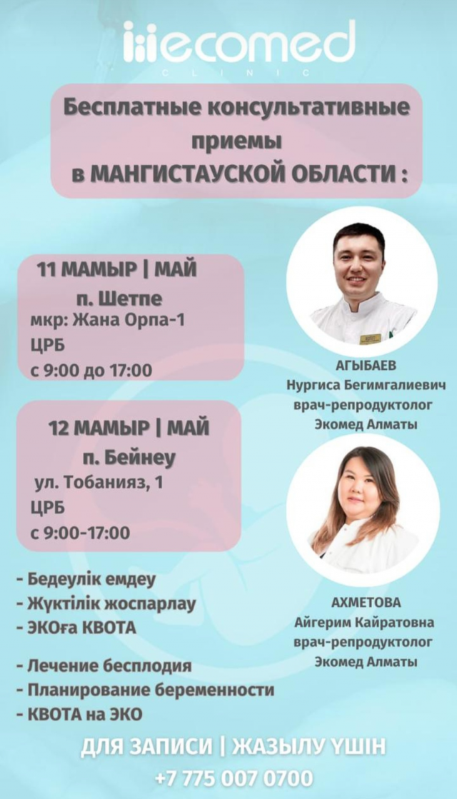 11-мамыр күні 9:00-ден 17:00-ге дейін Алматыдан келген дәрігер-репродуктолоктар Маңғыстау орталық аудандық ауруханасында тегін кеңес жүргізеді.