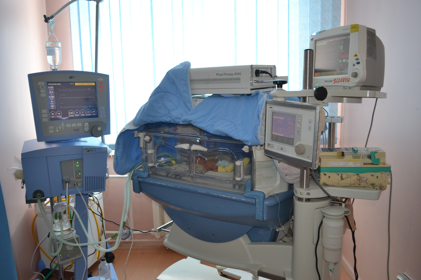 Бөлімше қазіргі замануи аппаратурамен қамтамасыз етілген: артериялық қысымды, тыныс алу қисығын, сатурацияны,транскутанды газдар, жылылықты өлшеуді,жүрек және қан айналымын, электрокардиограмманы талдауға монитордауға мүмкіндік береді,демалатын және шығаратын газдардың құрамын талдау. Респираторлық қолдау аппараттары өкпенің жасанды желдеткіші ретінде, жаңа туған нәрестелерге, шала туған балаларға және ересек жастағы балаларға да жүргізуге мүмкіндік береді. Бөлімшеде өкпеге жоғары жиілікті желдеткішін өткізіп және азоттың оксидімен ингаляциялық терапия жасау мүмкіндігі бар.