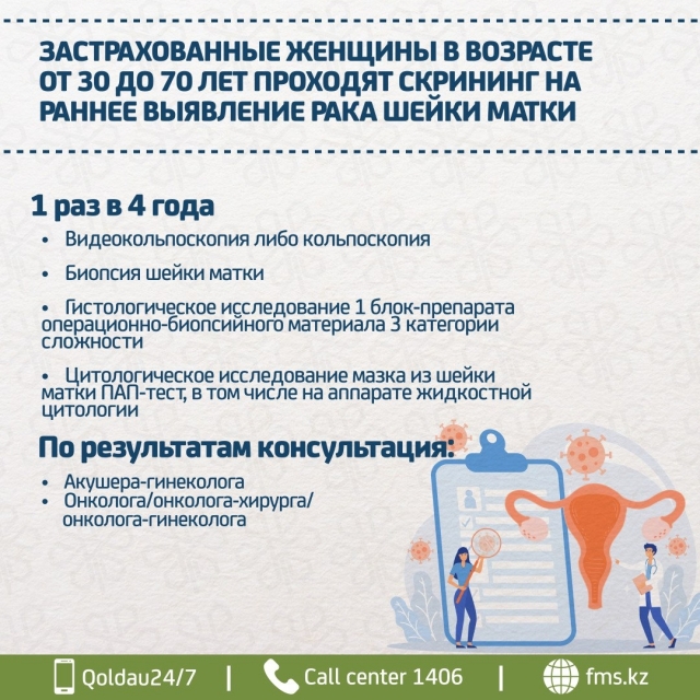Застрахованные женщины в возрасте от 30 до 70 лет 1 раз в 4 года проходят СКРИНИНГ НА РАННЕЕ ВЫЯВЛЕНИЕ РАКА ШЕЙКИ МАТКИ