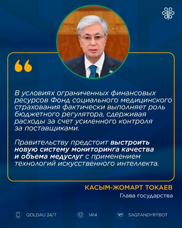 В условиях ограниченных финансовых ресурсов Фонд социального медицинского страхования фактически выполняет роль бюджетного регулятора, сдерживая расходы за счет усиленного контроля за поставщиками», - отметил Касым-Жомарт Токаев.